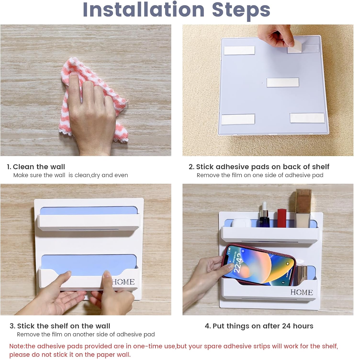 【Easy Installation】Fast&No drilling installation, zero harm to the wall. Use the 5 Double sided tapes to stick the bedside shelf to the wall perfectly. The adhesive is very strong enough to hold up 10 lbs. Please watch our installation video,remember you must wipe the walls(not wall paper) clean before you use the tapes.