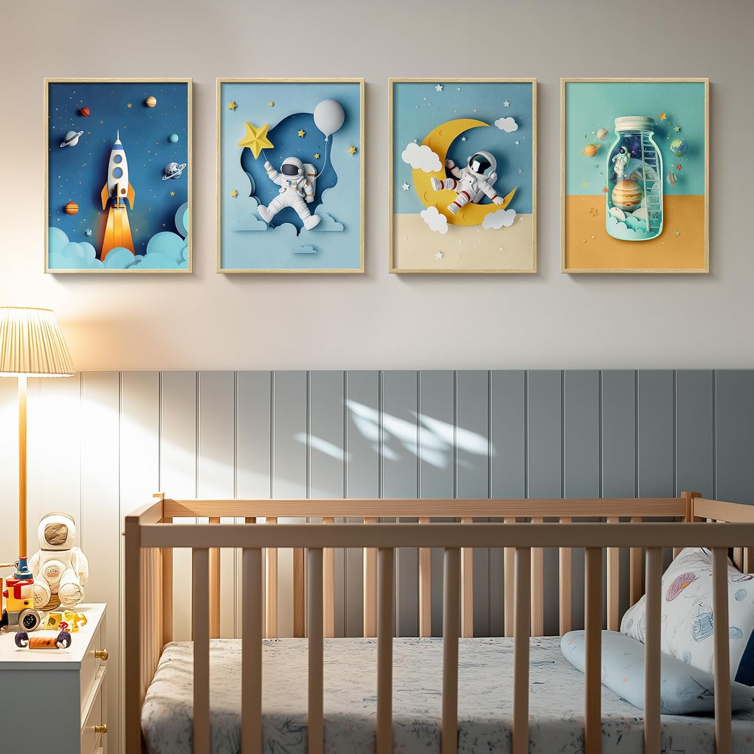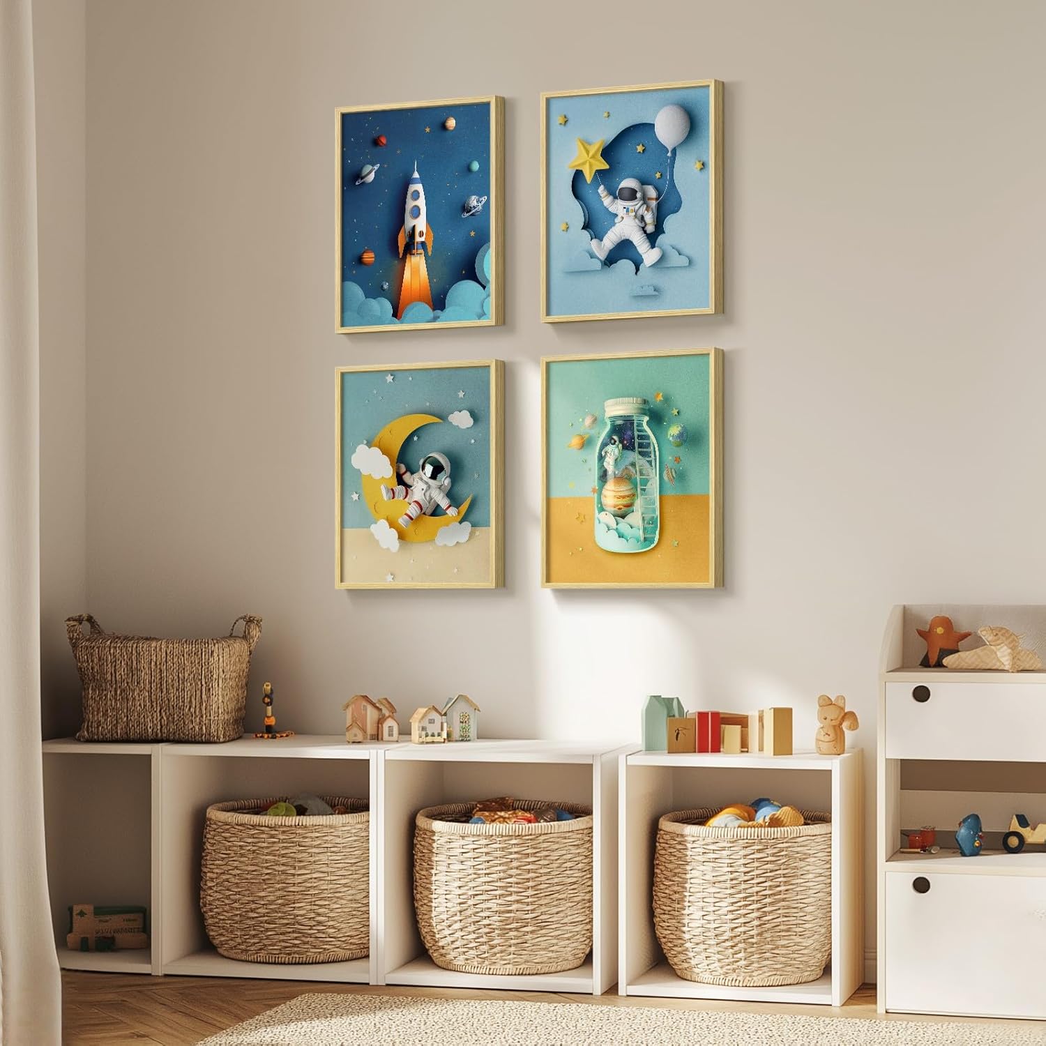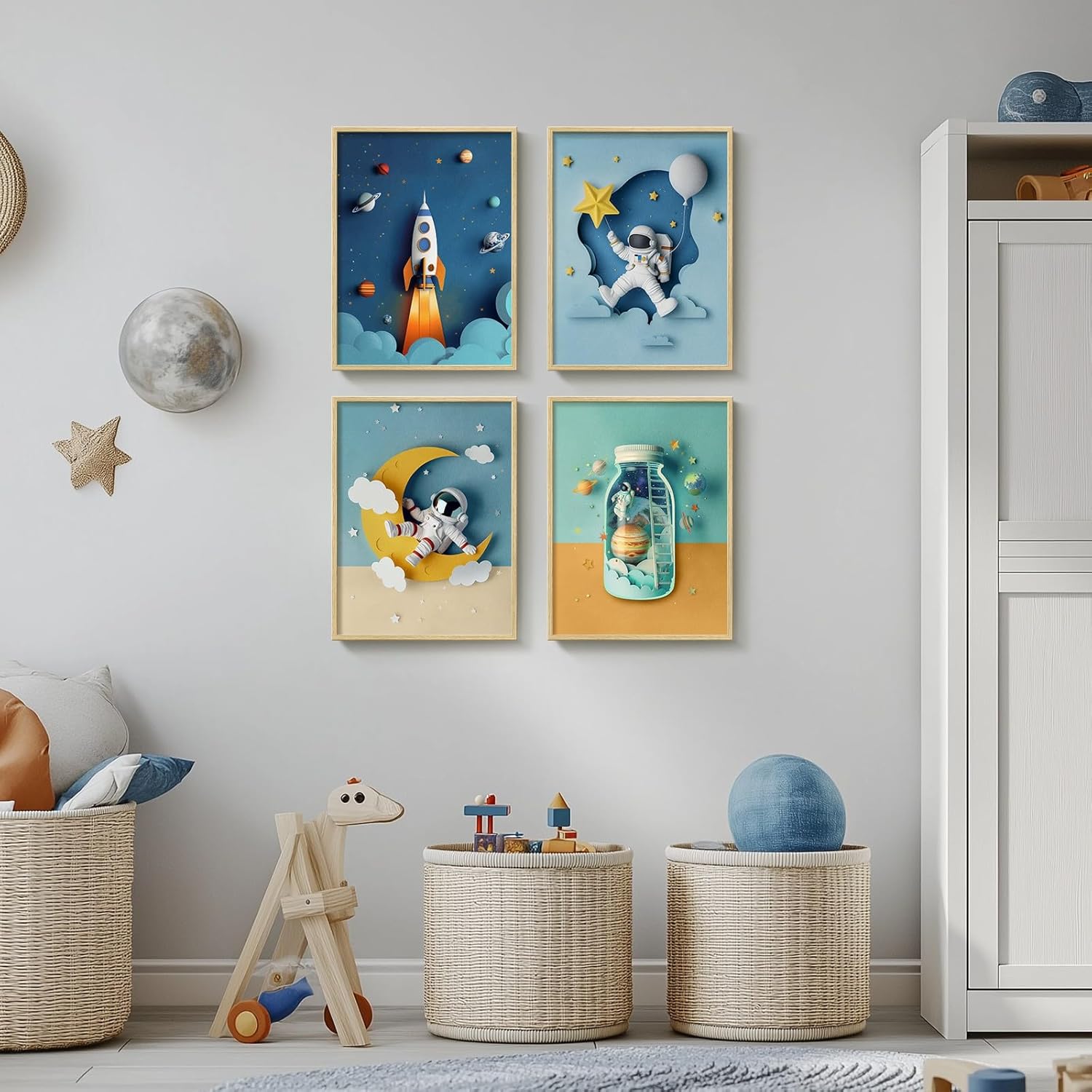 [As Great As The Picture]: This set of cool wall art focuses on space and astronauts, and is rich in science fiction and exploration elements. The rockets, astronauts, planets, and other elements are visually striking. The colors—blue, yellow, and others—are harmoniously matched, creating a fresh and bright atmosphere. This color scheme effectively captures children’s attention and is ideal for decorating nursery, bedroom, kids’ room, boys’ room, baby room and bathroom