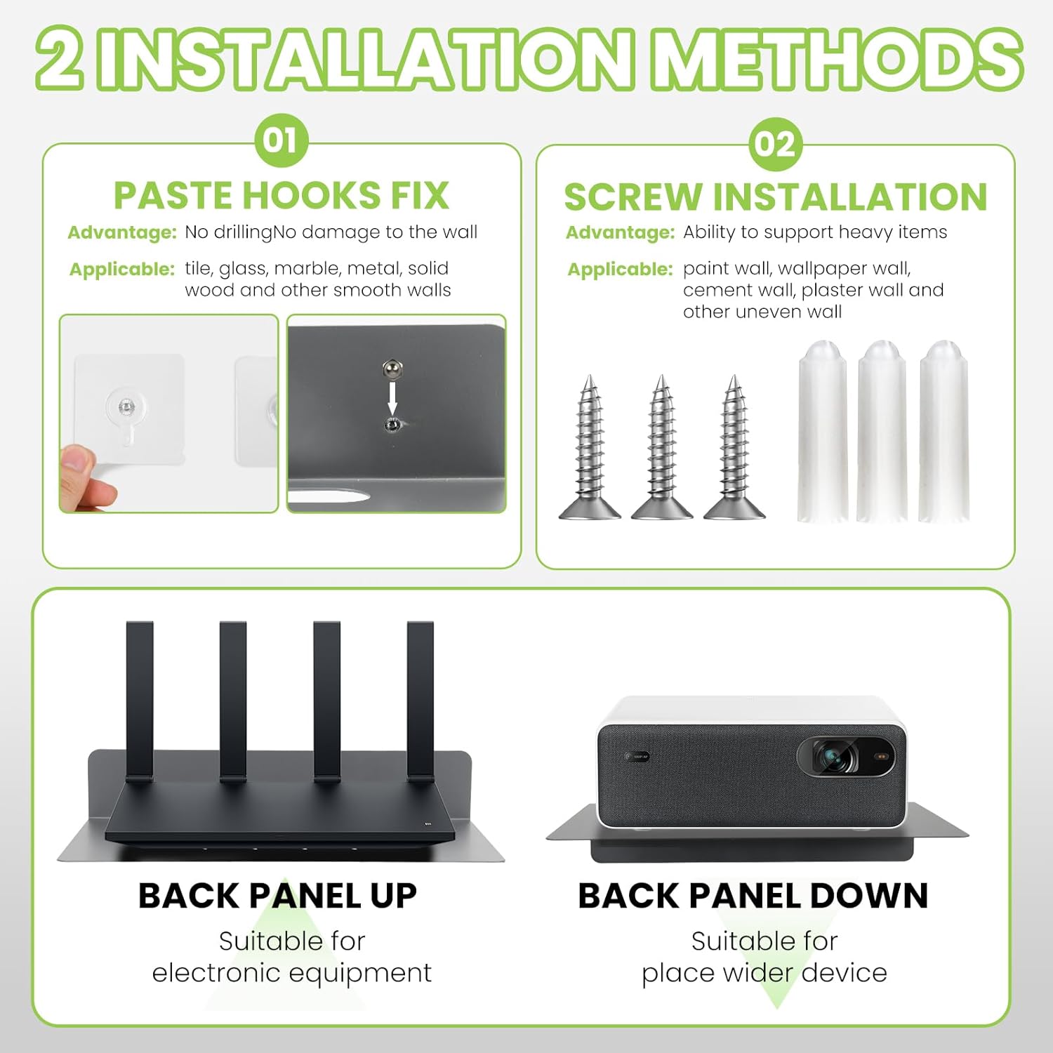Two Ways to Install: Use the accessories sent with the cable box with the cable box rack of the wall-mounted TV, just insert the screws and drill the rack to a specific location, and it’s done. Or you can choose to install without drilling.