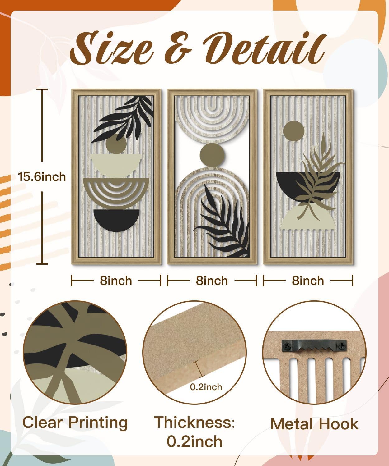 Putuo Decor Boho Abstract Wall Art, Set of 3, Modern Geometric Botanical Wooden Wall Decor, Mid-Century Minimalist Framed Artwork, Neutral Toned Aesthetic Prints, for Living Room, Bedroom, Office